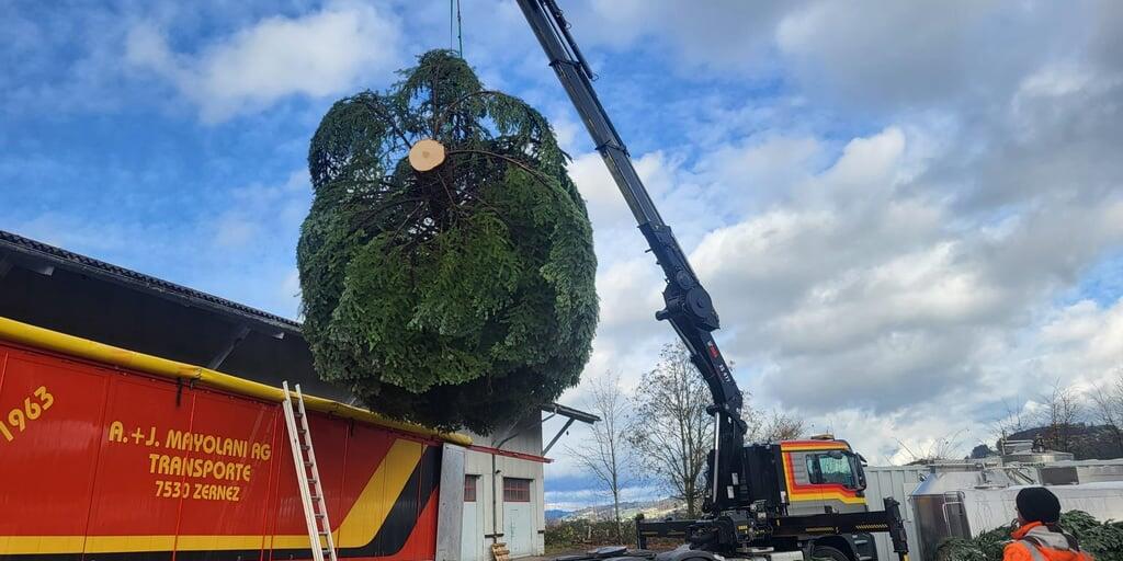 Auf geht es Richtung St.Moritz: Der Baum wird im unteren Toggenburg verladen.