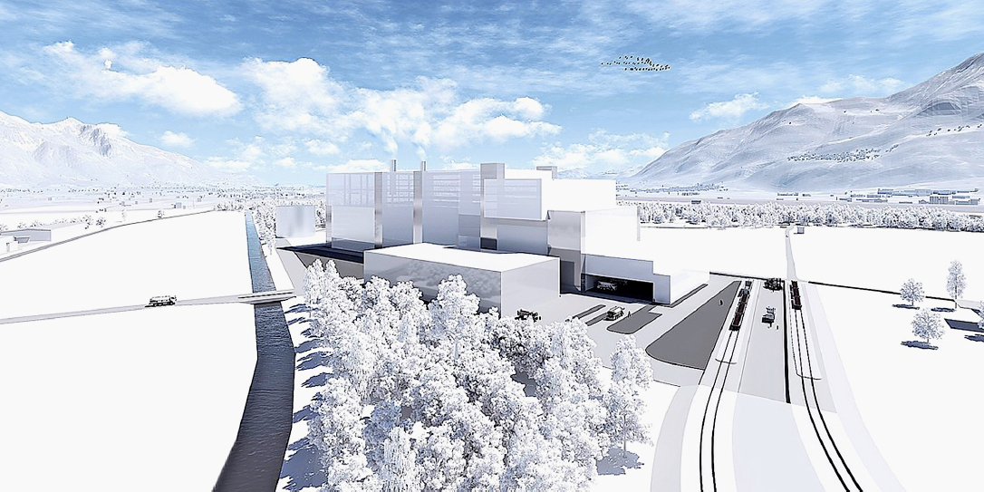 Etwa so könnte die neue Kehrichtverbrennungsanlage imOchsensand aussehen. Die Visualisierung zeigt bereits: Kehricht soll nicht nur auf der Strasse, sondern auch per Bahn angeliefert werden.
