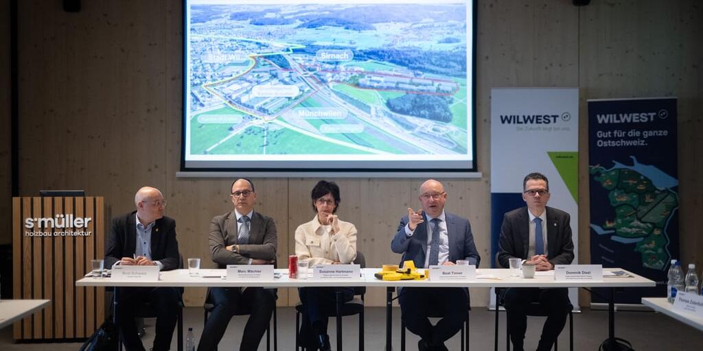 Geballte politische Präsenz an der Medienorientierung zu Wil West: Beat Schwarz, Präsident der Regio Wil, die St.Galler Regierungsräte Marc Mächler, Susanne Hartmann und Beat Tinner sowie der Thurgauer Baudirektor Dominik Diezi.