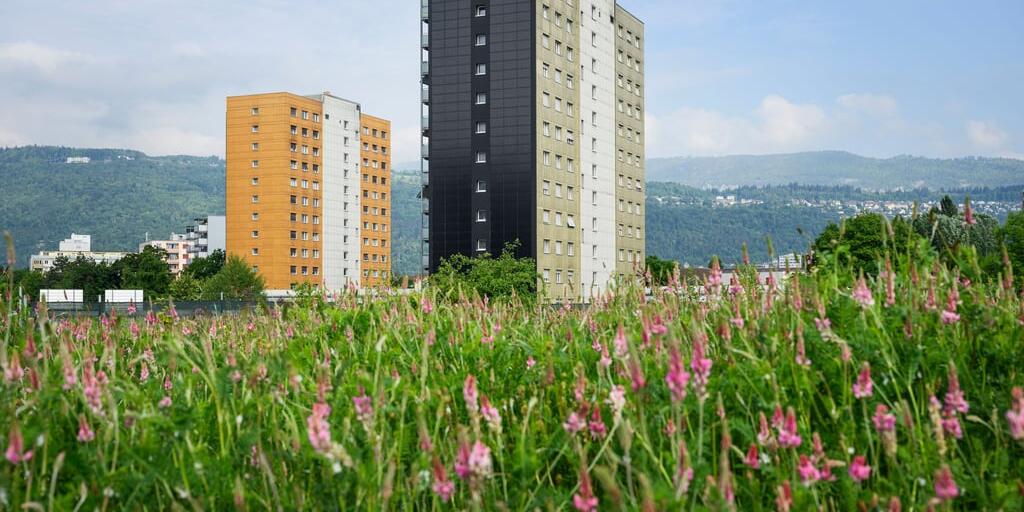 Das bessere Ranking der Schweiz hat mit dem Zubau erneuerbarer Energien zu tun, so wie diese Solarfassade an einem Hochhaus in Biel.