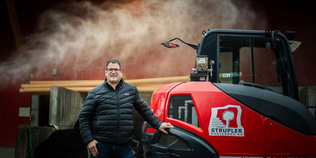 Sporadisch setzt er sich immer noch selber an den Bagger: Manuel Strupler, Gartenbau-Unternehmer und Wahlkampfleiter der SVP Schweiz.