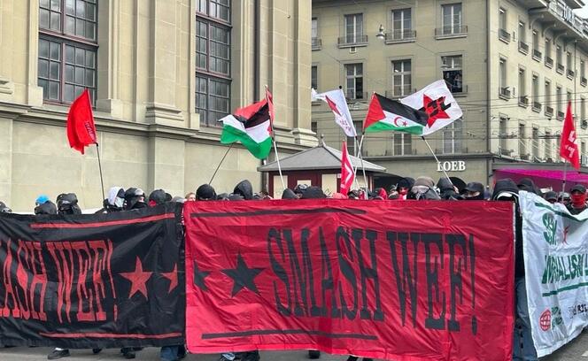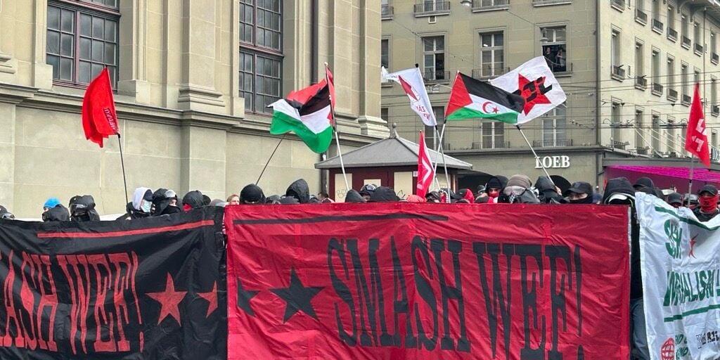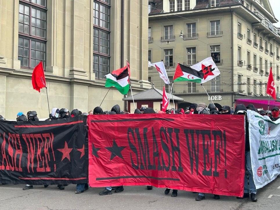 Am Samstagnachmittag haben sich auf dem Bahnhofplatz in Bern wenige Hundert Personen versammelt, um gegen das Weltwirtschaftsforum in Davos zu demonstrieren. Es waren Transparente mit Aufschriften wie «Smash WEF», aber auch Palästinaflaggen zu sehen. Unter den Demonstrierenden befanden sich auch mehrere Dutzend Vermummte. Vereinzelt wurden Böller gezündet.