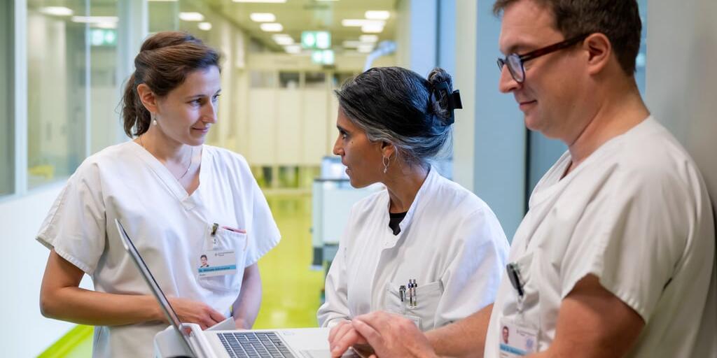 Nina Khanna, Chefärztin Infektiologie am Universitätsspital Basel teilt ihr Wissen mit Assistenzärztin Michaela Schumacher (l.) und Chefarzt Intensivmediziin David Berger. Zum Wohle der Patienten optimieren sie gemeinsam den Einsatz von Antibiotika.