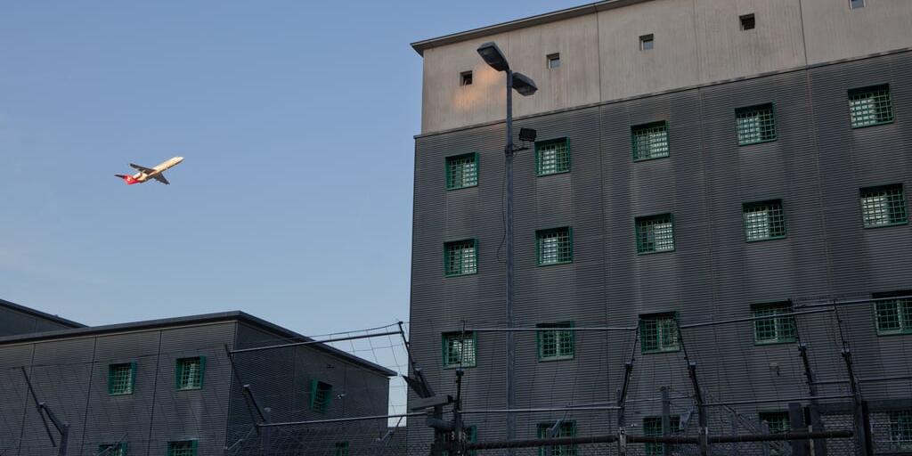Ein Flugzeug überquert das Ausschaffungsgefängnis am Flughafen Zürich.
