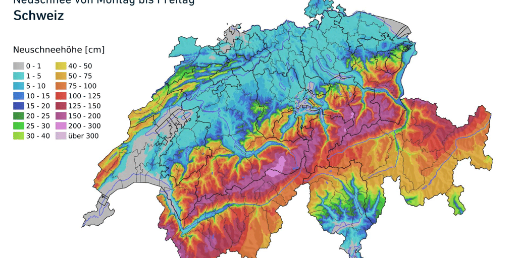 Am Alpennordhang gilt am Mittwochnachmittag die Warnstufe 3, wie das Bundesamt für Meteorologie und Klimatologie MeteoSchweiz schreibt. Zwischen dem östlichen Berner Oberland, den Schwyzer und Glarner Alpen und dem Alpstein sowie im nördlichen Prättigau werden 20 bis 40 cm Schnee erwartet. Oberhalb von 1000 Metern sogar bis 100 cm Neuschnee. In den angrenzenden Gebieten sowie in den westlichen Voralpen und Alpen gilt Warnstufe 2.