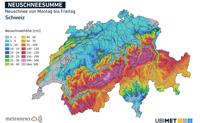 Am Freitag erfolgt im Laufe des Tages eine langsame Wetterberuhigung. Am Alpennordhang und in Nordbünden oberhalb von 1000 Meter ist laut Meteoschweiz mit 15 bis 25 Zentimentern Neuschnee zu rechnen, sonst 5 bis 15 cm Neuschnee.