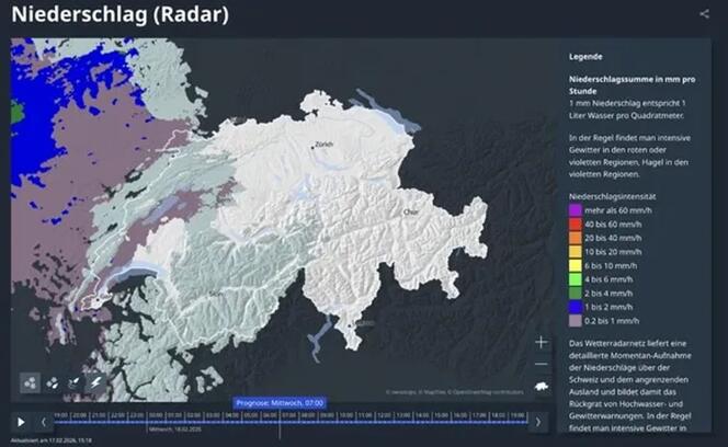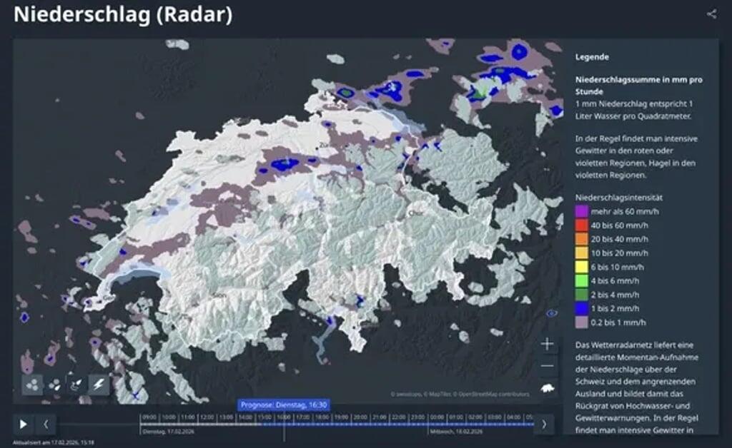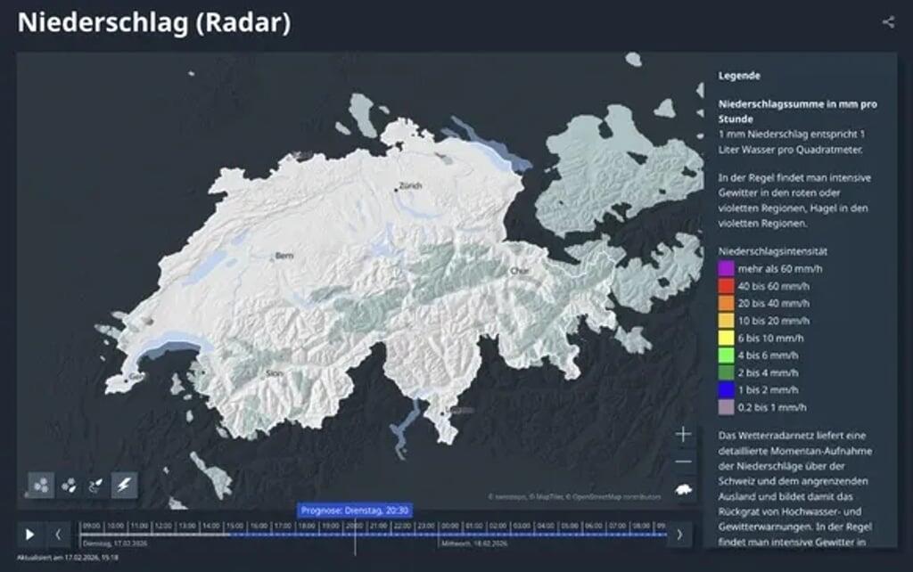 Im Laufe des heutigen Tages verschieben sich die Schneefälle verstärkt vom Wallis über den Kanton Graubünden in den Osten, wie der Niederschlagsradar von MeteoSchweiz zeigt: