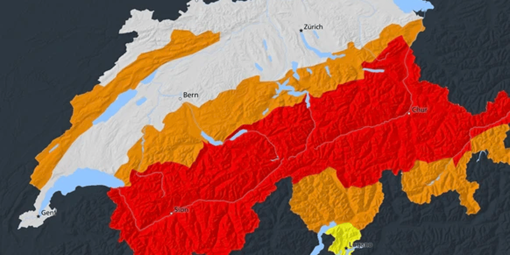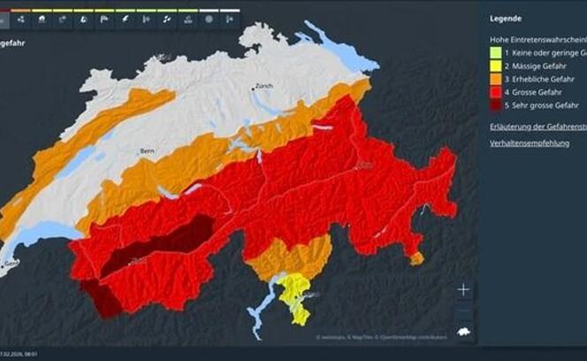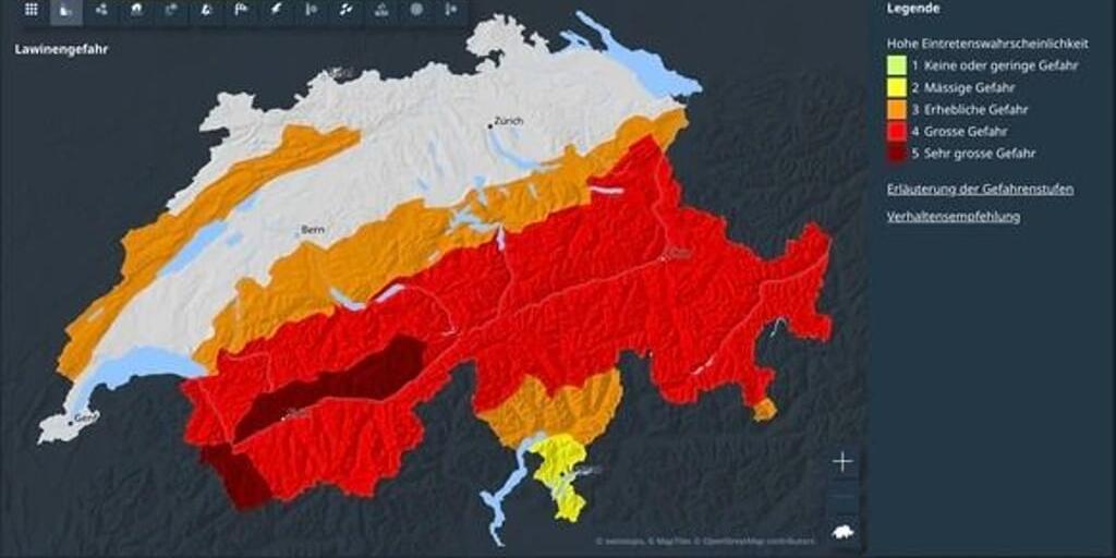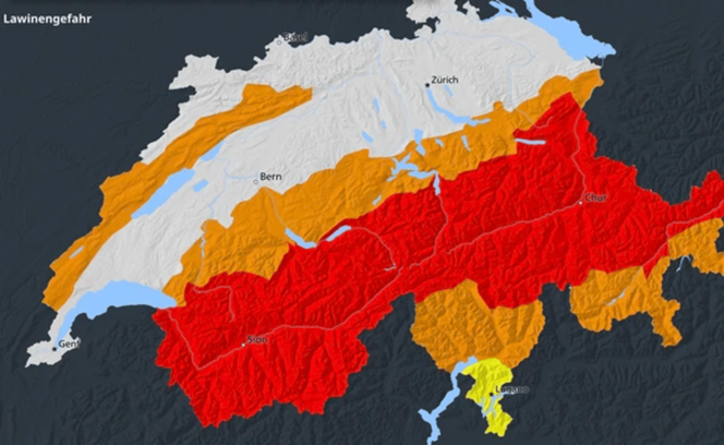 Der kräftige Schneefall in der Schweiz lässt die Gefahr von Lawinen weiter ansteigen. Für viele Teile der Alpen spricht der Bund eine Warnung aus. Für Teile des Wallis gilt gar die höchste Alarmstufe (sehr grosse Gefahr). In den dunkelrot markierten Gebieten sind «viele sehr grosse und spontane Lawinen zu erwarten», heisst es. Der Bund empfiehlt deshalb, auf Schneesport abseits geöffneter Pisten und Routen zu verzichten. Zudem könnten Lawinen auch ausserhalb der bekannten Lawinenzüge vorstossen, schreibt der Bund. (watson.ch)