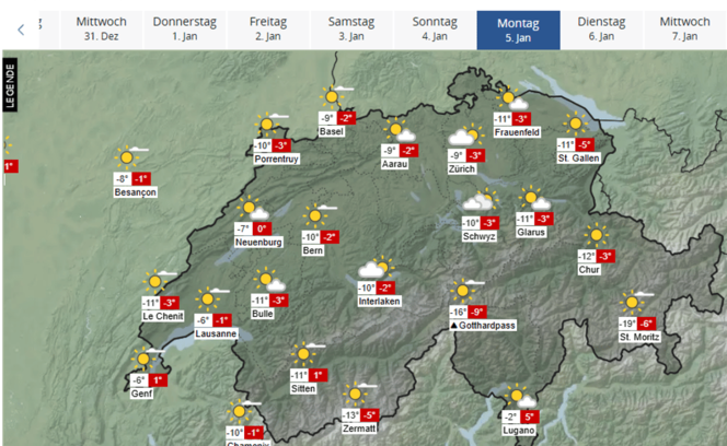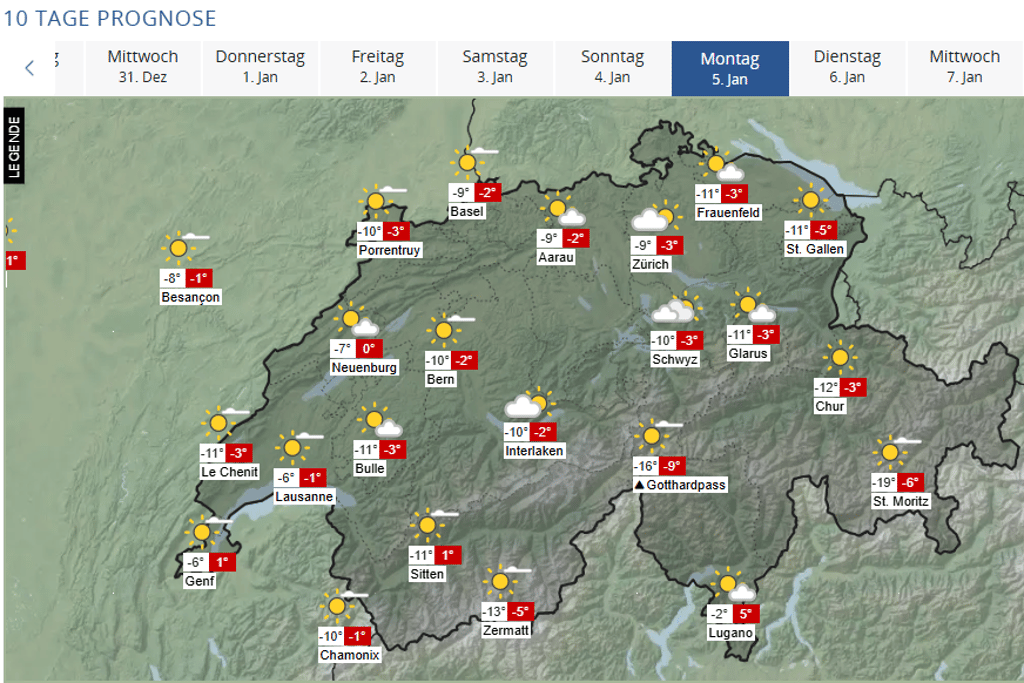 Am Sonntag steigen die Temperaturen auf frühlingshafte 10 bis 15 Grad und die Sonne setzt sich zunehmend durch. Beständig werde das Wetter laut Meteonews aber es erst zu Beginn der kommenden Woche – mit Prognosen über 10 Grad. Die Prognosen deuten ebenfalls auf mildere Temperaturen hin. (watson.ch)